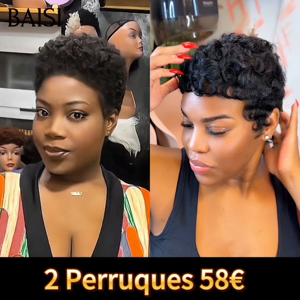 48H Livraison TVA 0€ BAISI Facile à Revendre PROMO Prix Grossite 2 Perruques 58€ sans Colle finger wave et afro curly en France en 100% Cheveux Humains