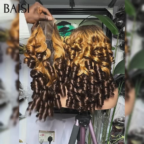 BAISI Perruque lace closure Bouclée loose Wave en Couleurs Marron Mixte Miel 4#27# en 100% Cheveux Humains BS65