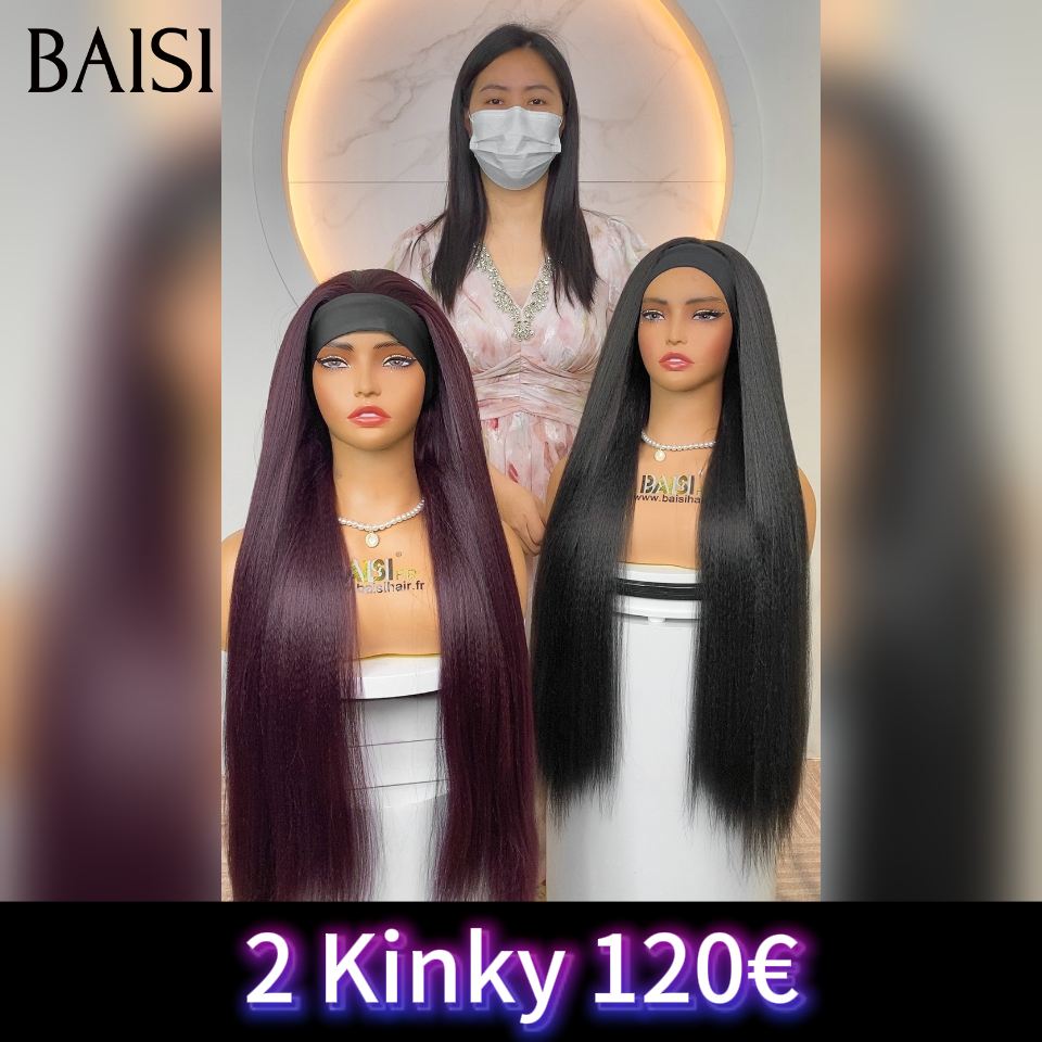 BAISI promotion 2 perruques 120€ Blended human hair Perruque bandeau kinky straight yaki 32 Pouces 2 couleurs Bordeaux ou noir sans Colle en 100% Cheveux Humains