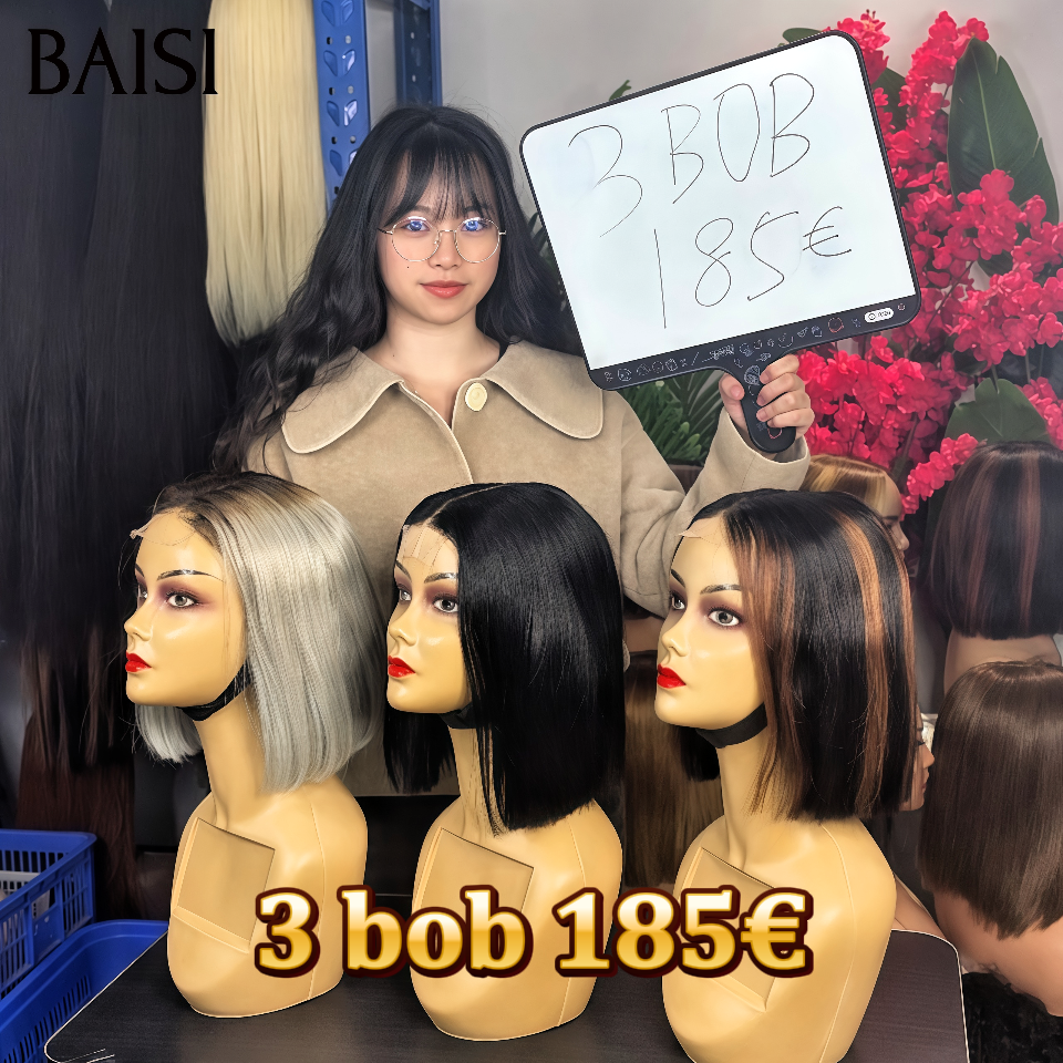 BAISI promotion 3 perruques 185€ BOB 3 looks pour tous les jours 2x6 lace closure sdd bone straight Perruque 8 Pouces en 3 couleurs noir et gris et NOIR Mixte Marron en 100% Cheveux Humains