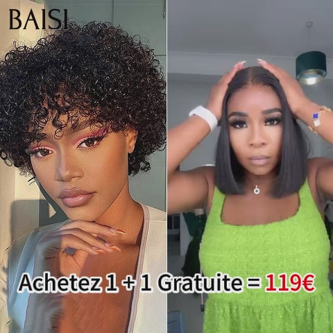BAISI Achetez 1 + 1 Gratuite = 119€ sans Colle pixie curly wave et 13X4 Lisse 12 Pouces en 100% Cheveux Humains BS60
