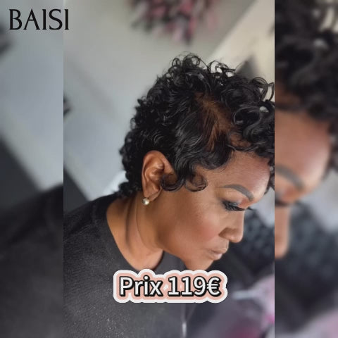 BAISI Perruque Full Lace 100% Cheveux Naturels Full Lace Perruque 119€ Pixie Finger Wave petite coupe en Couleur Noir en 100% cheveux humains