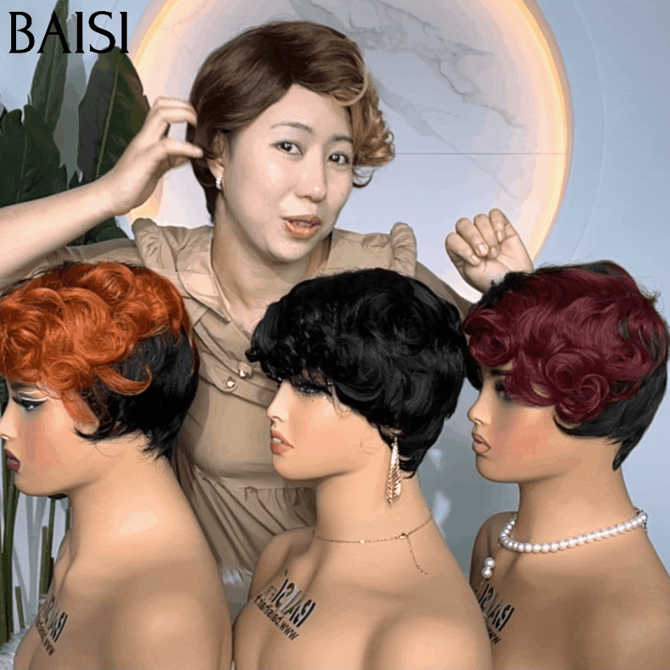 48H Livraison TVA 0€ BAISI Pixie perruque chioma finger wave NOIR Avec Frontale 55€ ou En 4 Couleur #4#27 et orange et 99J et noir 160€ sans colle sans lace en 100% Cheveux Humains
