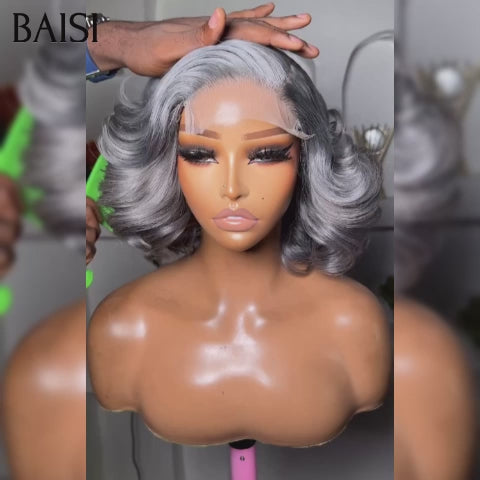 BAISI Collection Poivre et Sel 13X4 lace Perruque Pixie Bouclée Wave Couleurs personnalisées gris comme la video en 100% Cheveux Humains