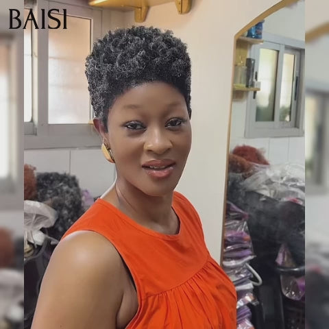 BAISI Perruque Collection Poivre et Sel Perruque Pixie Afro Curl 65€ sans Colle bouclé partout Coupe vibrante en couleur gris ou avec Frontale 99€ en 100% cheveux humains