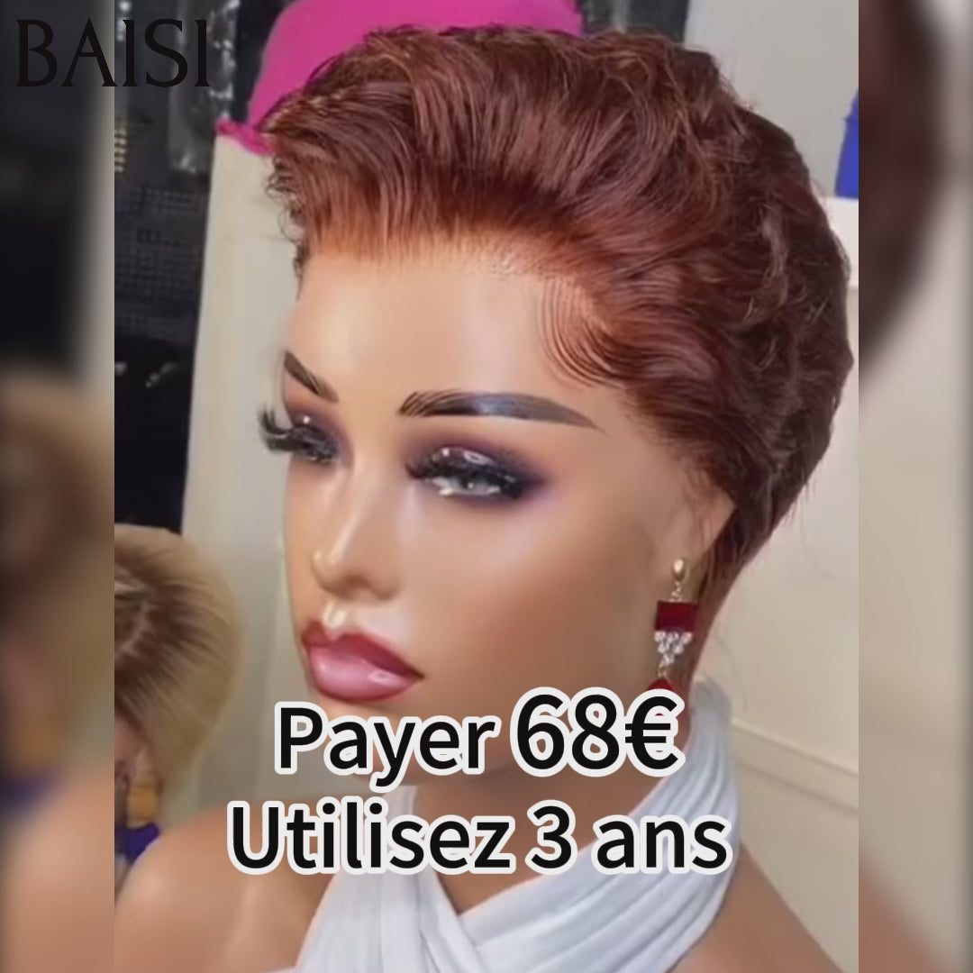 48H Livraison TVA 0€ BAISI 13X4 Lace Frontale Pixie Coiffure à la Mode Marron 4# 68€ et Perruque Pixie Finger Wave petite coupe fabriqué à la machine 49€ En 100% Cheveux Humains FR20