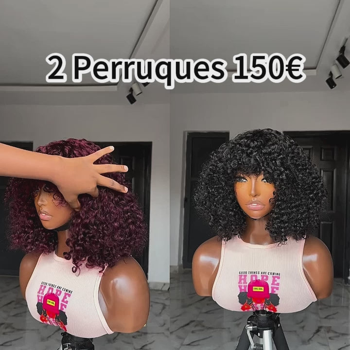 48H Livraison TVA 0€ BAISI 2 Perruques pour revendre 150€ Bob curly wave avec Frange 12 pouces couleur NOIR et Bordeaux en 100% vrais cheveux humains FR20
