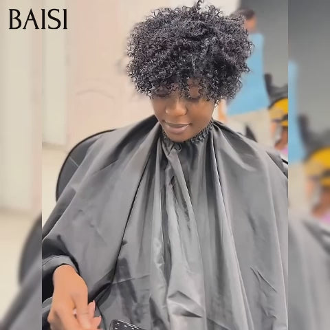 48H Livraison TVA 0€ BAISI afro curly Fabriqué à la Machine NOIR Sans Lace 55€ ou 2 Perruques 100€ Pixie Afro Curl 13x4 lace frontal bouclé partout Couleur orange 350# & Bordeaux 99J# en 100% cheveux humains F-905