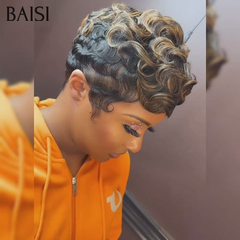 Achetez 2 Prix D'usine BAISI Achetez 2 perruques minimum au prix d'usine fournisseur en France TVA 0€ 48H arrivé pixie Fabriqué à la Machine finger wave 4/27# ou 13X4 Lace Perruque pixie Lisse NOIR en 100% Vrais Cheveux Humains (Pas Besoins De Code)