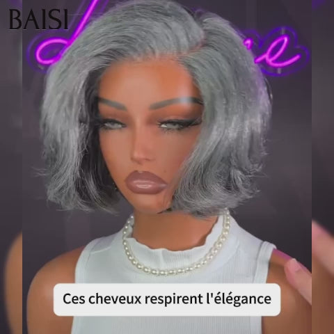 BAISI Collection Poivre et Sel Perruque 8P 96€ Bob Lisse noir mixte gris Pré-plucked Pas Besoin de Colle en 100% Raw Hair Lace déjà couper