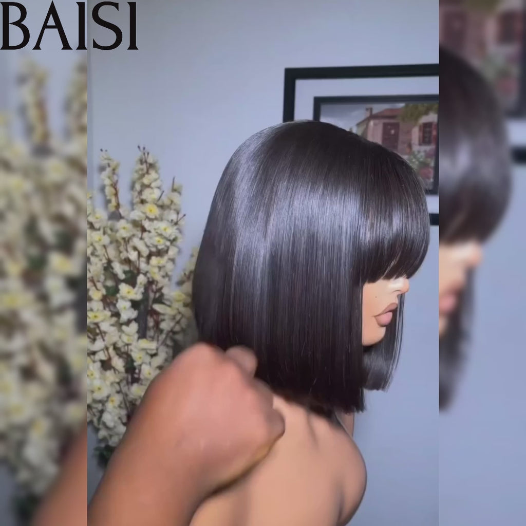BAISI Perruque 2X4 lace 65€ Bob Lisse avec Frange en Noir Sans Colle en 100% Cheveux Humains BS65