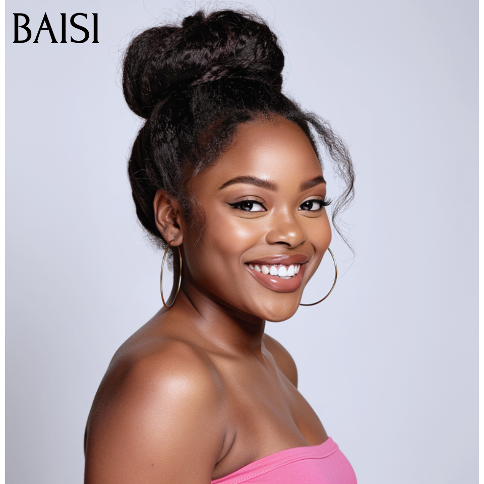 BAISI 13x4 lace frontal yaki Déjà Coiffée 18 pouce 109€ avec en chignon bun ou 4X4 perruque En Couleur Noir moitié prix kinky Straight 106€ en 100% cheveux humains MP50