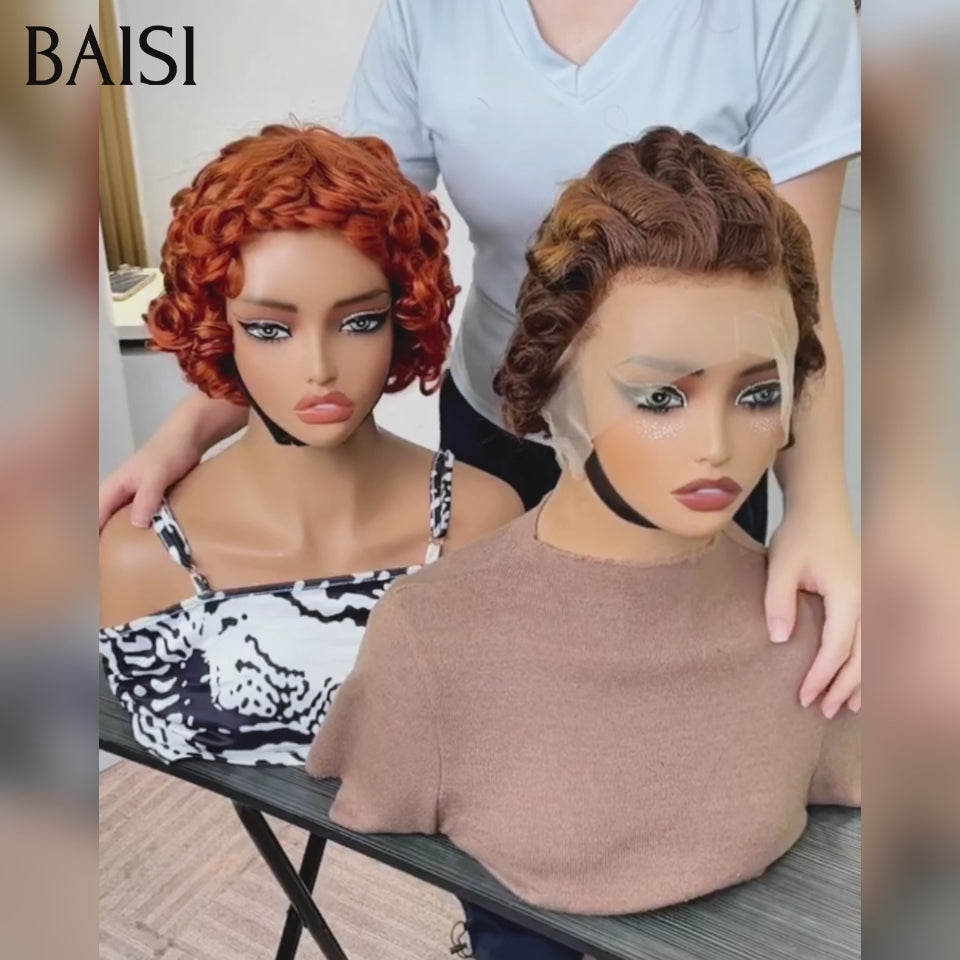 BAISI 2 Perruques 80€ egg wave avec Frange Sans Colle en couleur orange et 13x4 lace pixie Marron mixte miel 100% Cheveux Humains