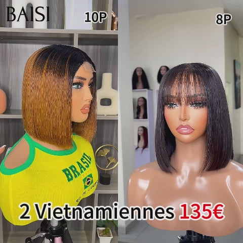 BAISI 2 perruques Vietnam Hair Flash Offer 135€ Vente en gros de luxe 2X6 lace 10 Pouces en couleur miel et lisse bob avec frange NOIR DE luxe en 100% vrais cheveux humains FR38