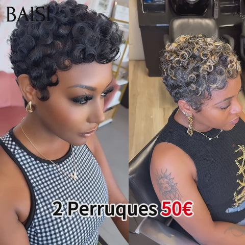 Promo Noël 48H reçu BAISI 2 perruques Flash Offer 50€ Vente en gros en France Perruques Chioma pixie finger wave Fabriqué à la Machine en couleur 4/27# ou 1B# en 100% vrais cheveux humains BS60