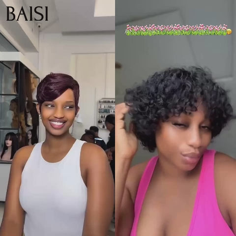 BAISI 2 perruques pixie Offre spéciale 80€ 13X4 lace frontal pixie Bordeaux et sans Colle curly wave en 100% vrais cheveux humains