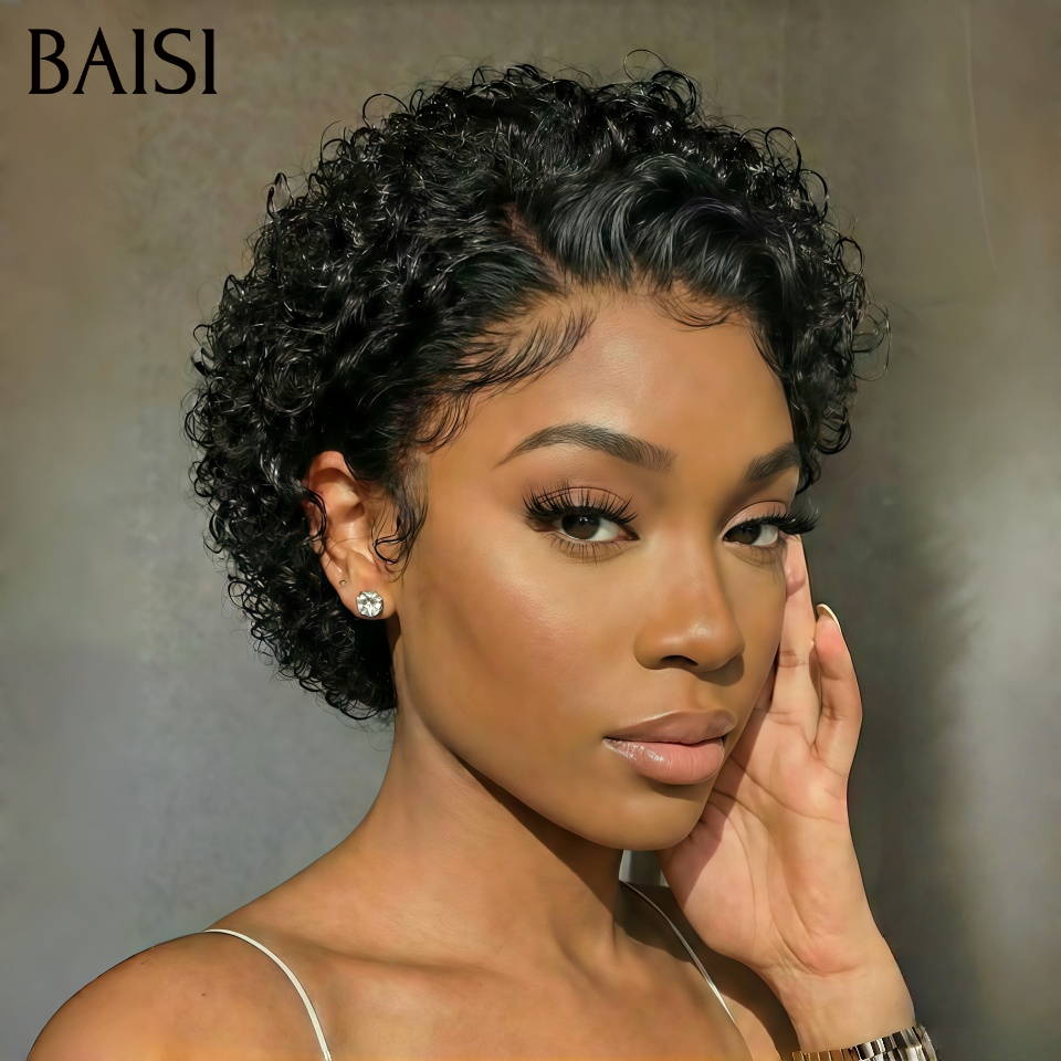 48H Livraison TVA 0€ BAISI perruque en Couleur 1B pixie curly wave avec 13x4 lace frontal en France en 100% cheveux humains
