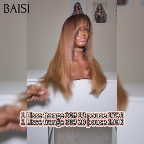 BAISI Perruque Lisse avec Frange 30# miel ou Bouclée curly Wave avec Frange 18 Pouces 300% densité en Couleur marron en 100% Cheveux Humains FR20