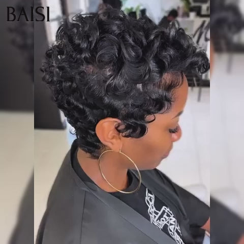 BAISI Wellige Perücke, Pixie-Schnitt, volle Spitze, Fingerwelle, kleiner Schnitt in schwarzer Farbe aus 100 % Echthaar BS50