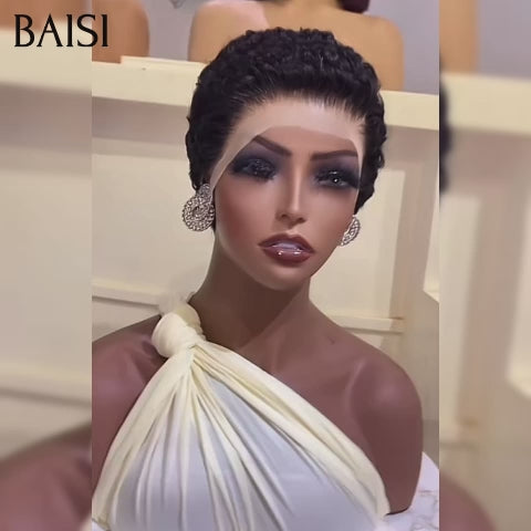 48H Livraison TVA 0€ BAISI Femme VIP 13X4 lace Perruque Pixie vague En Couleur noir 56€ Sans Colle finger wave 46€ en 100% Cheveux Humains