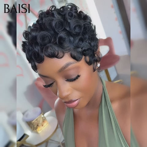 48H Livraison TVA 0€ BAISI 50€ Perruques Chioma Pixie Finger Wave petite coupe fabriqué à la machine couleur naturelle En 100% Cheveux Humains