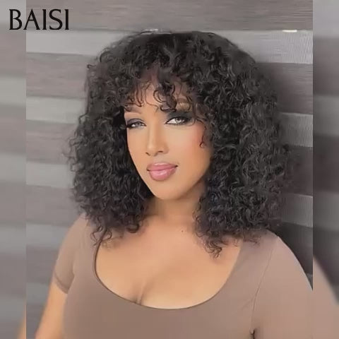 48H Livraison TVA 0€ BAISI Perruque Kinky Curly Bouclée avec Frange Noir 85€ 12 Pouces en 100% Cheveux Humains de Bonne Qualité CODE: FR20