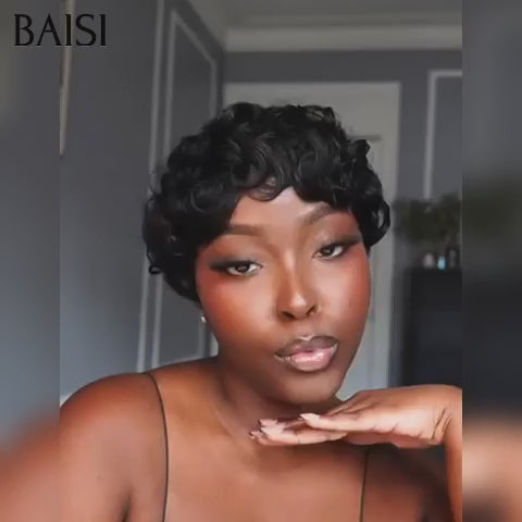 Promo Noël 48H reçu BAISI BLACK FRIDAY Offre limitée Perruque Chioma pixie sans lace 38€ finger wave NOIR Moitié Prix en 100% cheveux humains MP50