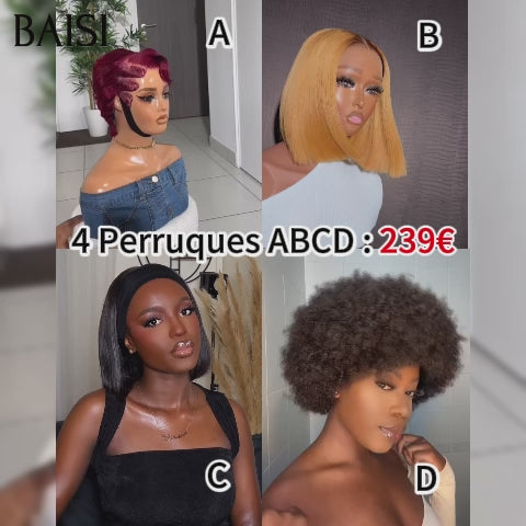 48H Livraison TVA 0€ BAISI 4 Perruques 239€ 13X4 pixie 99J# et 2x6 Lisse 8 Pouces et sans Colle afro curly ou pixie curly wave sans lace sans colle Noir 58€ en 100% Cheveux Humains