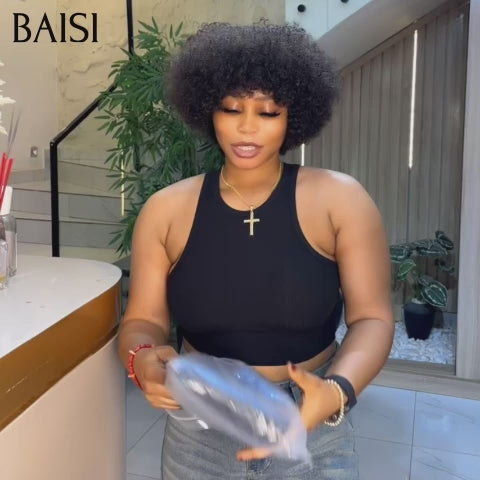 BAISI bob afro rizado 45€ negro sin pegamento sin encaje en 100% Cabello Humano hecho a máquina FR38