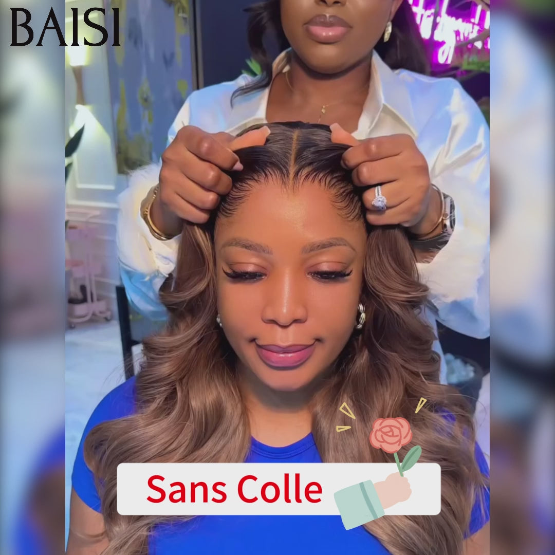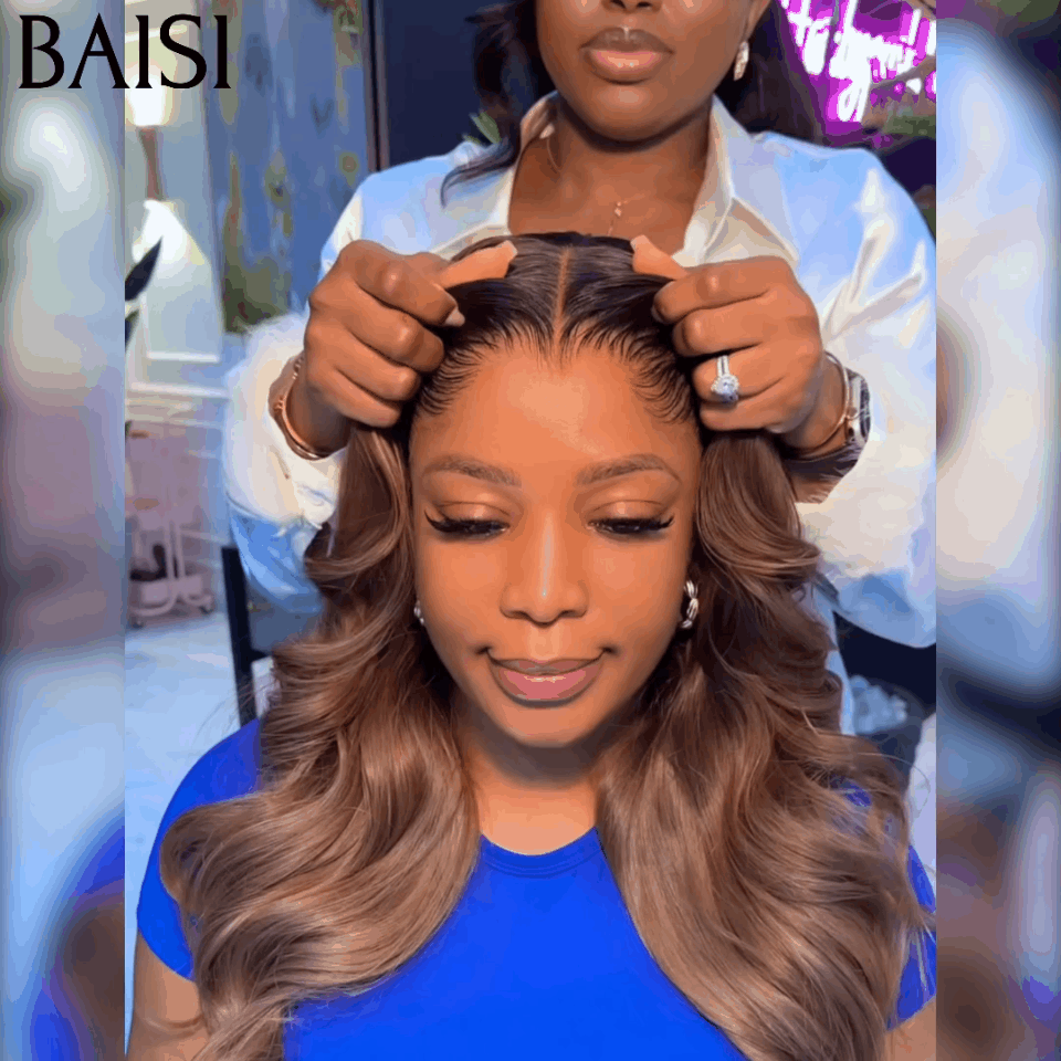 BAISI Peluca ondulada frontal del cuerpo 13x4 en marrón # 1B4 Pre-desplumada No se necesita pegamento en encaje de cabello 100% crudo ya cortado