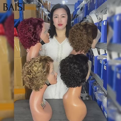 BAISI 4 Perruques 100€ pixie curly wave 13X4 lace frontal 4 couleurs différentes en 100% vrais cheveux humains