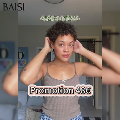 BAISI Prix 48€ Moitié Prix Perruque Pixie curly bouclé Noir sans colle 100% Cheveux Humains Fabriqué à la Machine MP50