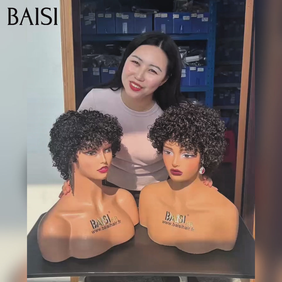 48H Livraison TVA 0€ BAISI Perruque pixie 50€ Facile à porter en France sans Colle Fabriqué à la Machine NOIR curl wave en 100% Cheveux Humains