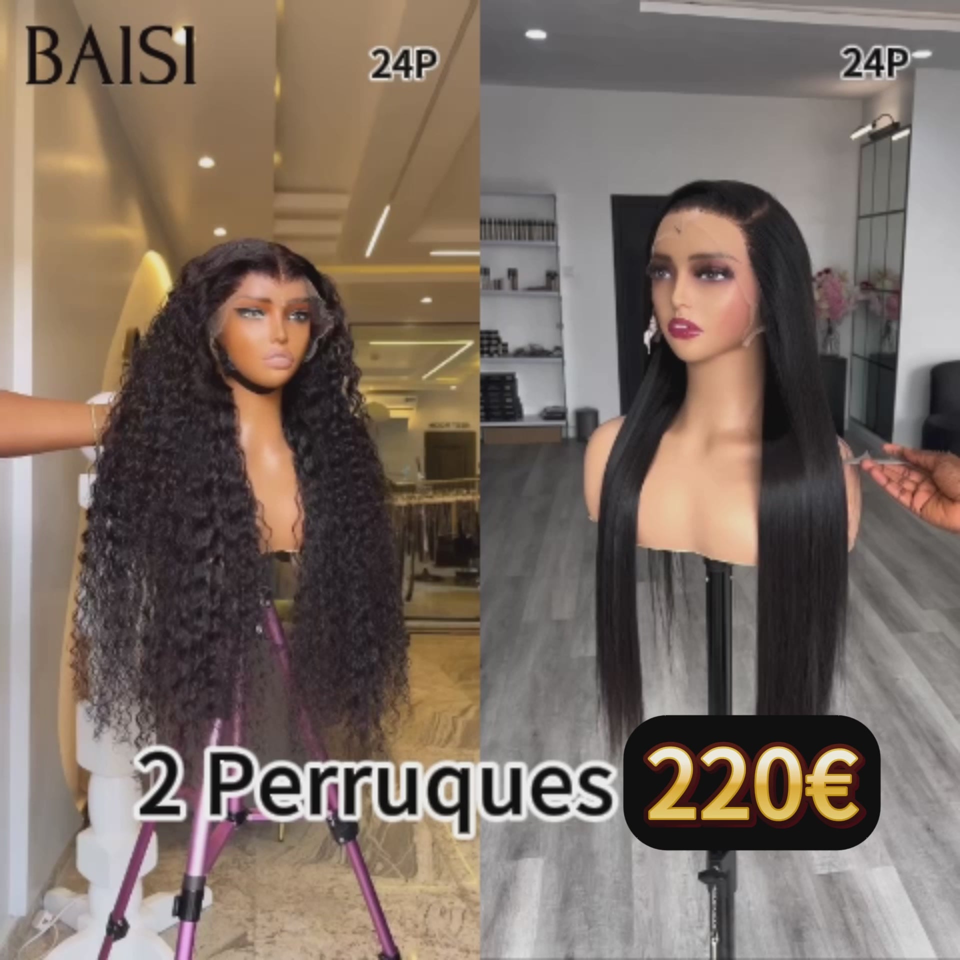 Promo Noël BAISI 2 Perruques pour revendre 220€ 13X4 curly wave et 4x4 lace closure Lisse 24 pouces couleur NOIR 200% densité en 100% vrais cheveux humains