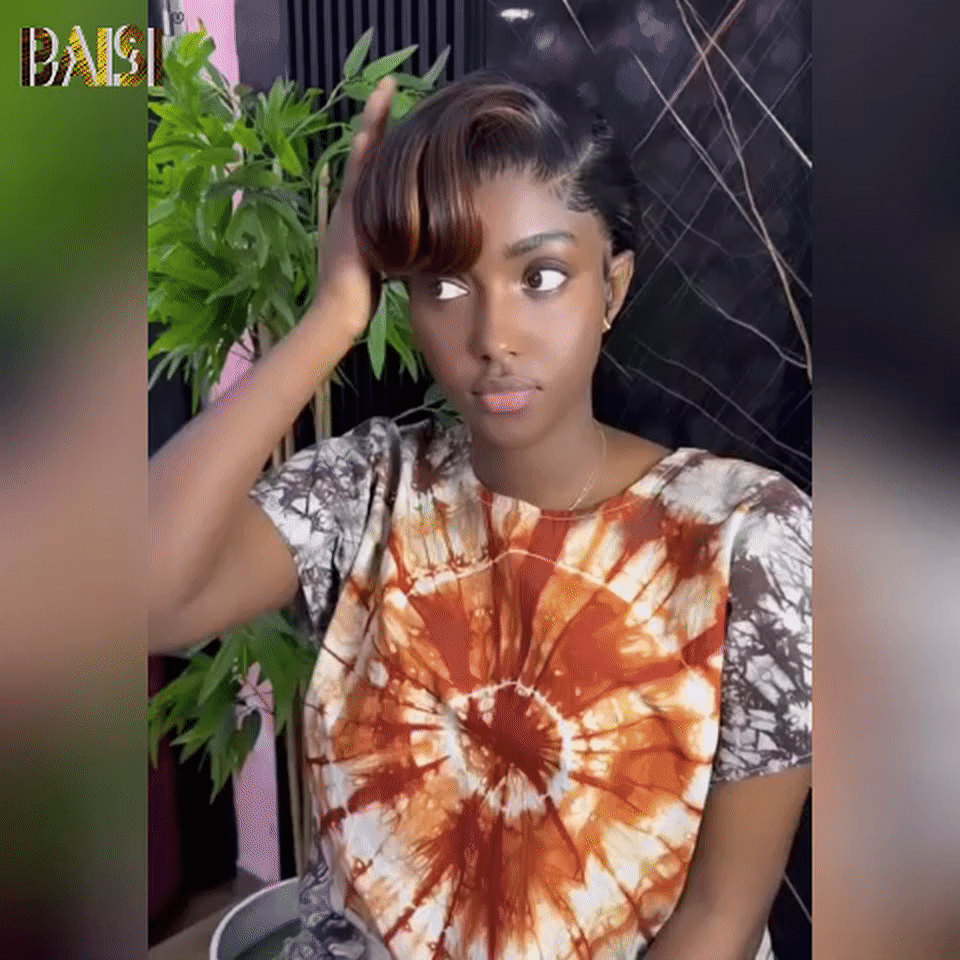 48H Livraison TVA 0€ BAISI Perruque Ondulée Coupe Pixie 13X4 Frontal Perruque personnalisée finger wave ou Lisse en Couleur Noir Mix Marron 1B#4# en 100% cheveux humains