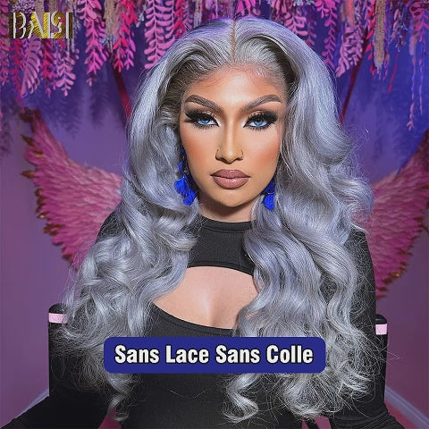BAISI Collection Poivre et Sel 13x4 Perruque Body Wave En couleur Gris Sans Colle Lace déjà couper Facile à Porter en 100% Cheveux Humains