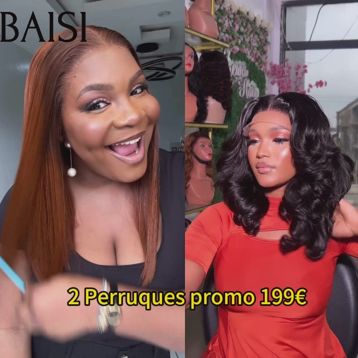 48H Livraison TVA 0€ BAISI 2 Perruques 249€ 13X4 Bob Lisse marron et 4X4 Boucle egg wave 16 Pouces NOIR en 100% Cheveux Humains vietnam hair FR38