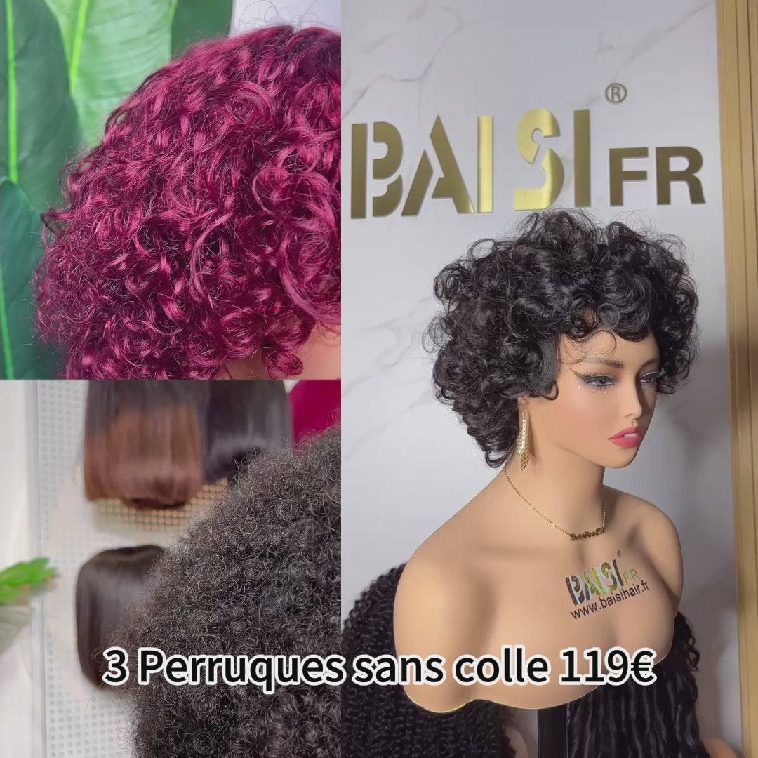 48H Livraison TVA 0€ BAISI 1 pixie 69€ en couleur 1BT4/350# ou Bob Sans Colle Sans lace water wave et egg wave et afro en 100% Cheveux Humains BS65