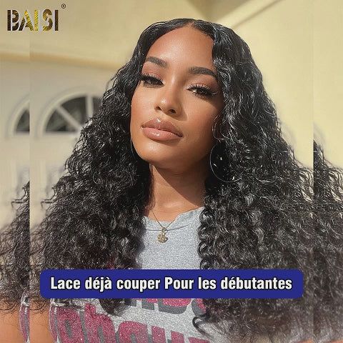 BAISI 4x4 Perruque Curly en Noir Sans Colle Lace déjà couper Facile à Porter en 100% Cheveux Humains
