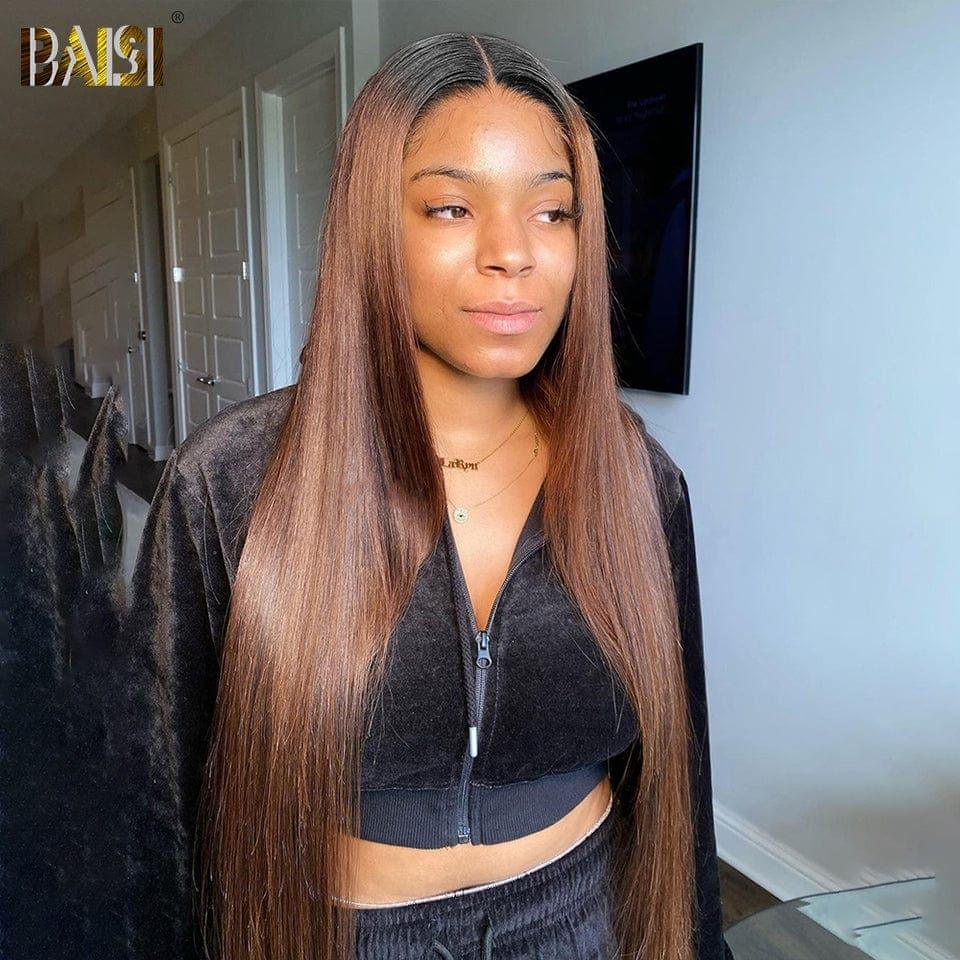 Achetez 2 Prix D'usine BAISI Achetez 2 perruques minimum au prix d'usine fournisseur Perruque Kinky Straight Noir Marron 1BT4# Sans Colle Lace déjà couper Facile à Porter en 100% Cheveux Humains (Pas Besoin de Code)