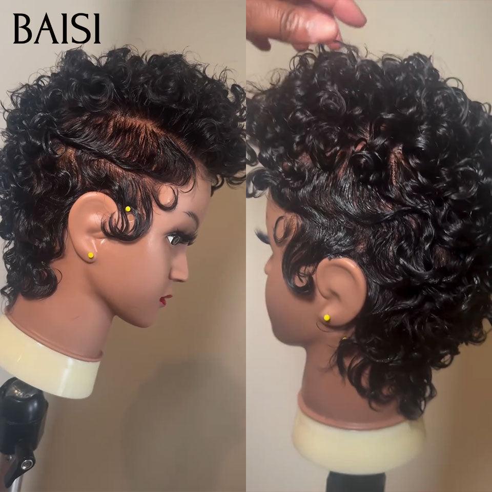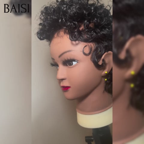 BAISI Perruque Full Lace 100% Cheveux Naturels Full Lace Perruque Pixie Finger Wave petite coupe en Couleur Noir en 100% cheveux humains FR20