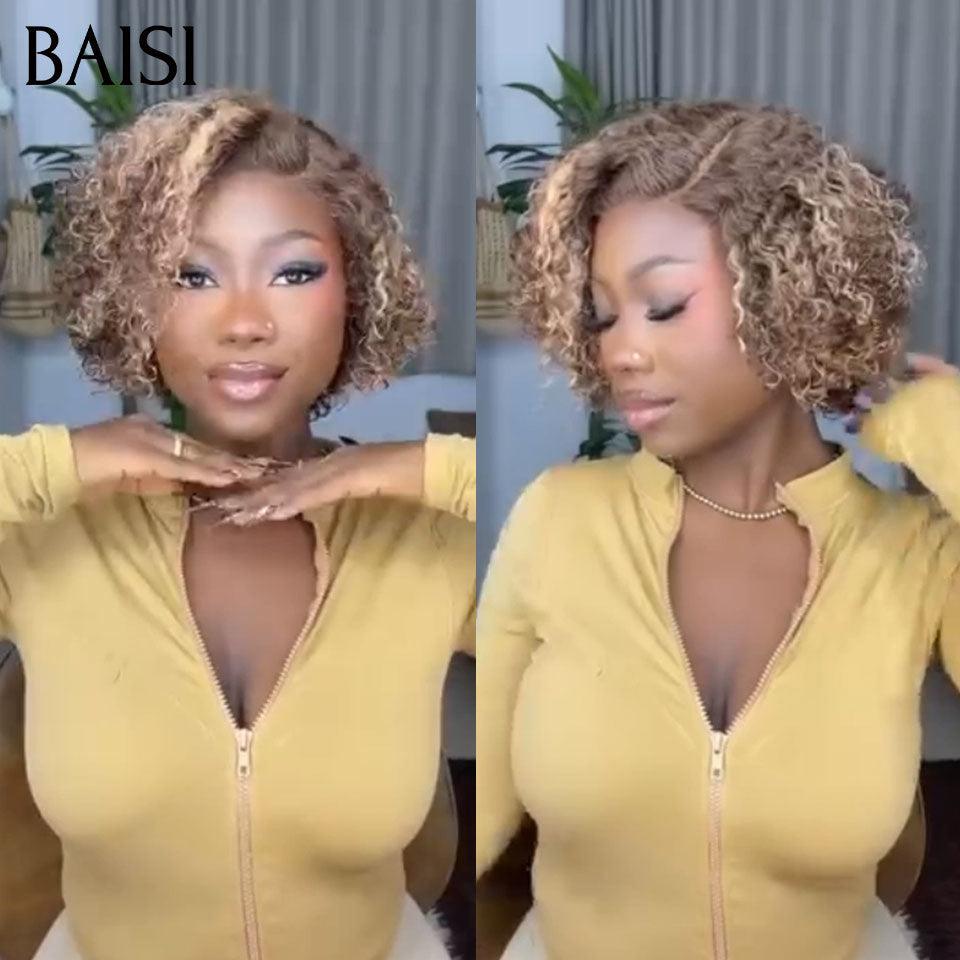 BAISI Perruque 13X4 lace bob Curly 8 Pouces Raie sur le côté 4/27# mixte en 100% Cheveux Humains