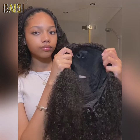 BAISI Perruque demi tête clips hair extension PROMOTION En Couleur Noir Curly wave en 100% cheveux humains
