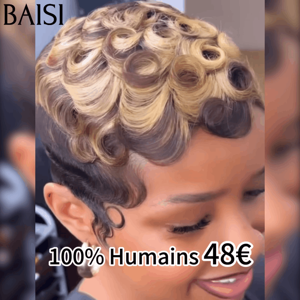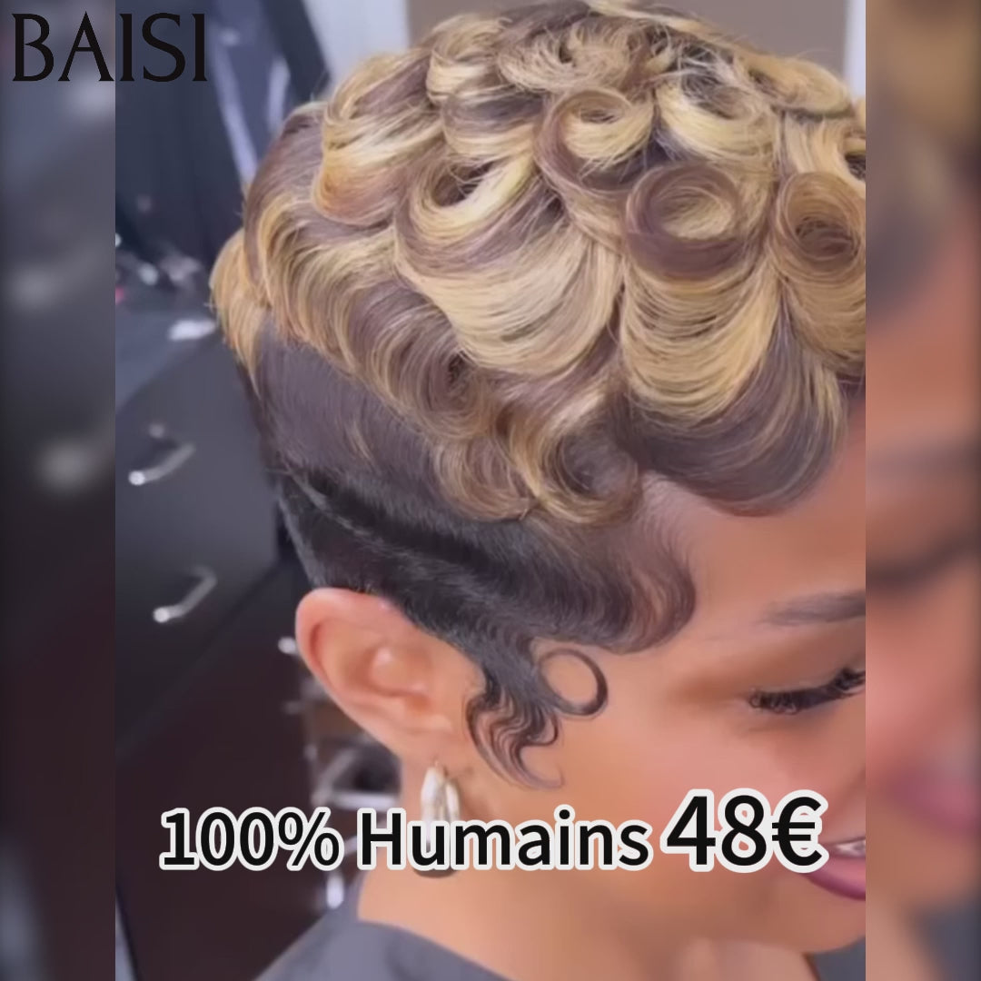 48H Livraison TVA 0€ BAISI Perruque Pixie Finger Wave petite coupe fabriqué à la machine 48€ en couleur marron mixte miel En 100% Cheveux Humains FR38