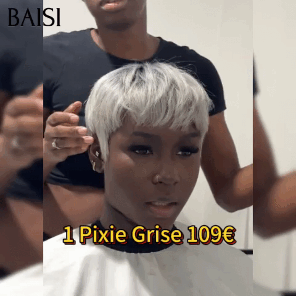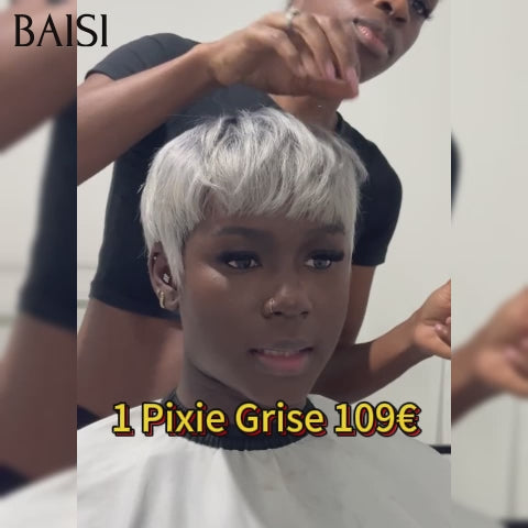 48H Livraison TVA 0€ BAISI Perruque Pixie lisse petite coupe fabriqué à la machine moitié prix NOIR 42€ ou 109€ en couleur 1B/Gris En 100% Cheveux Humains MP50