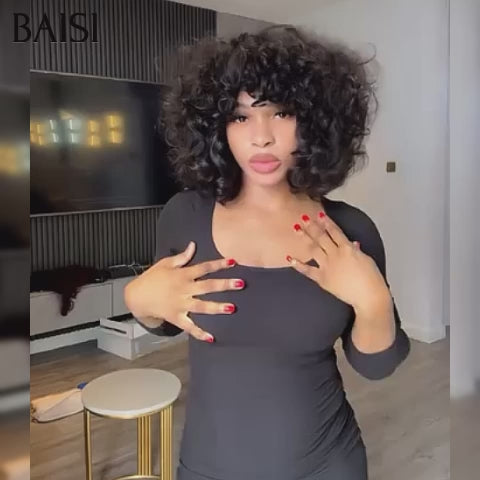 48H Livraison TVA 0€ BAISI Perruques bouclé egg Wave avec Frange 18 pouces 139€ 300% densité 2X4 lace Fabriqué à la Machine en 100% Cheveux Humains