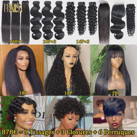 BAISI Vente En Gros Lot De 6 Perruques 9 Tissages 3 Closures Abordable 699 Euro En 100% Cheveux Humains