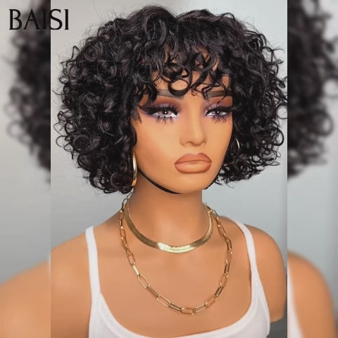 BAISI bouclé Wave avec Frange sans Colle 66€ ou 5X5 Perruque pixie Vague curly En Couleur Noir et Miel 1B-27# 95.99€ en 100% Cheveux Humains