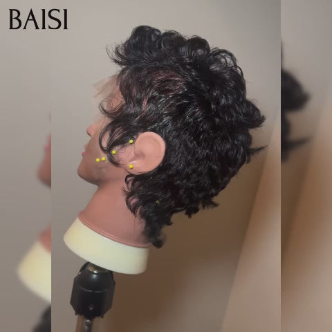 BAISI Peruca ondulada Pixie Cut Full Lace Finger Wave pequeno corte na cor preta em 100% cabelo humano BS50