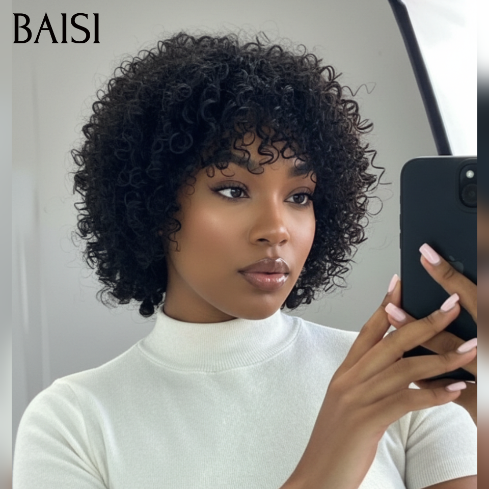 48H Livraison TVA 0€ BAISI Prix Perruque Pixie Afro Curl sans lace bouclé partout Noir en 100% cheveux humains
